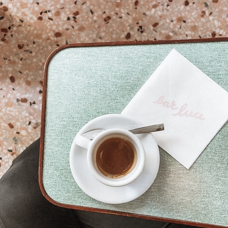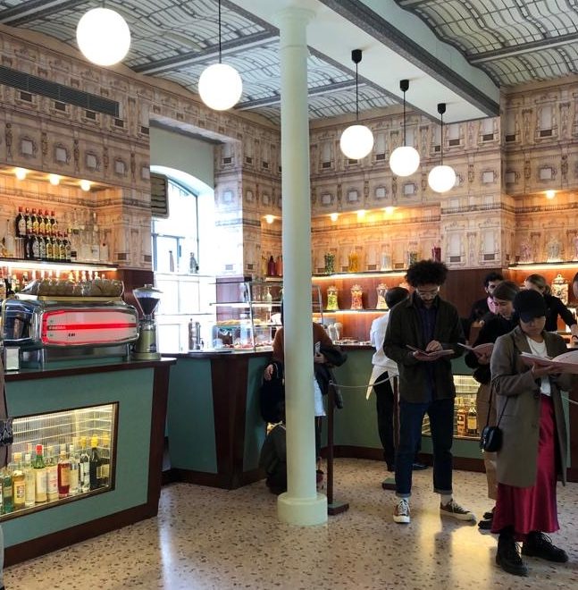 Nous nous sommes arrêtés boire un café dans l’antre de la Fondation Prada, au Café Luce décoré par le célèbre réalisateur Wes Anderson. Le café est préparé avec, pour les connaisseurs, la mythique faema e61. Toute une expérience !