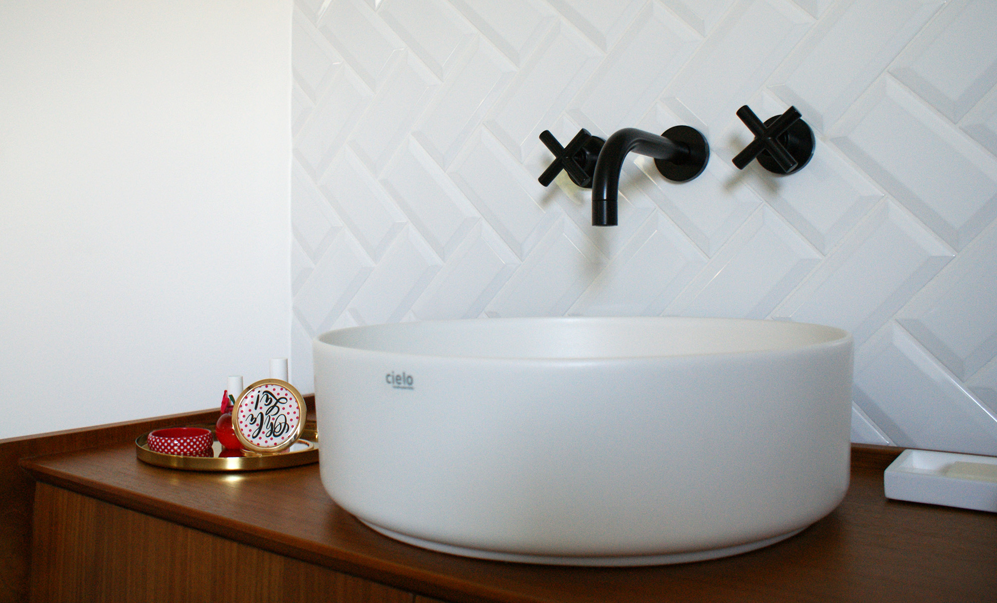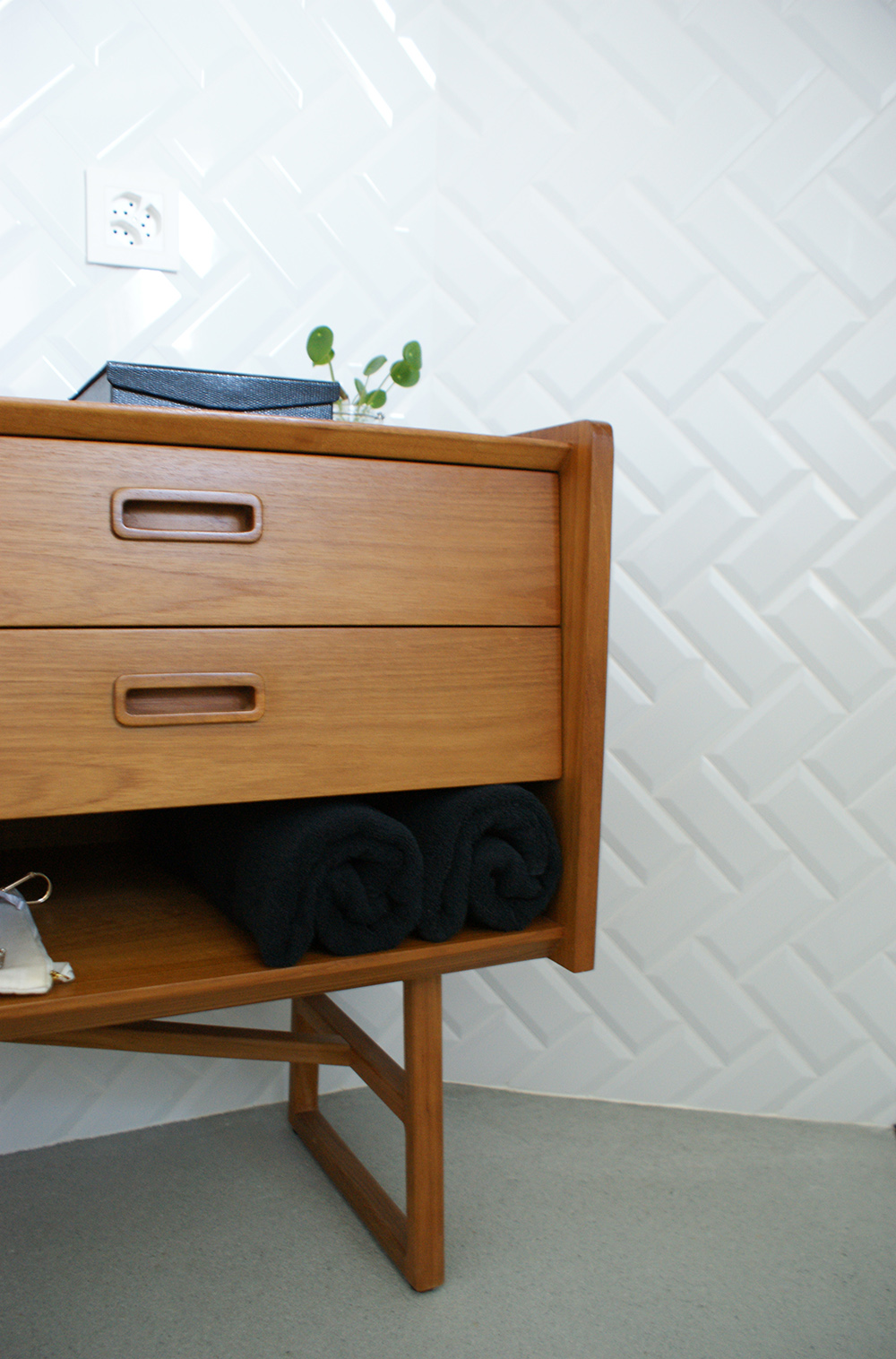 Le meuble qui supporte la vasque est une simple commode que nous avons percée pour y accueillir les écoulements. Il s’agit d’un meuble de la marque Tikamoon, spécialisée dans le mobilier en bois massif. La commode a un style vintage et les matériaux sont de qualité.