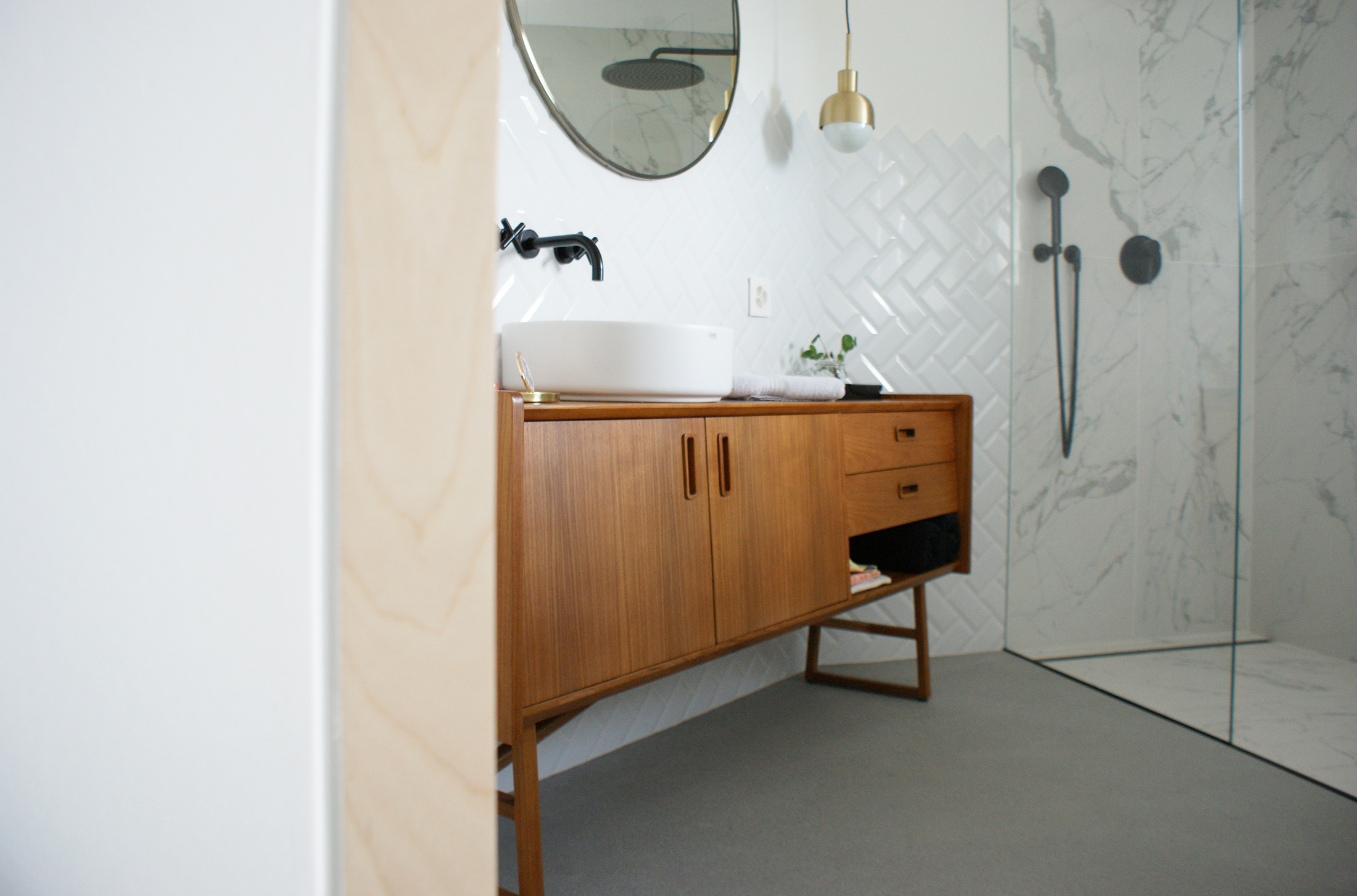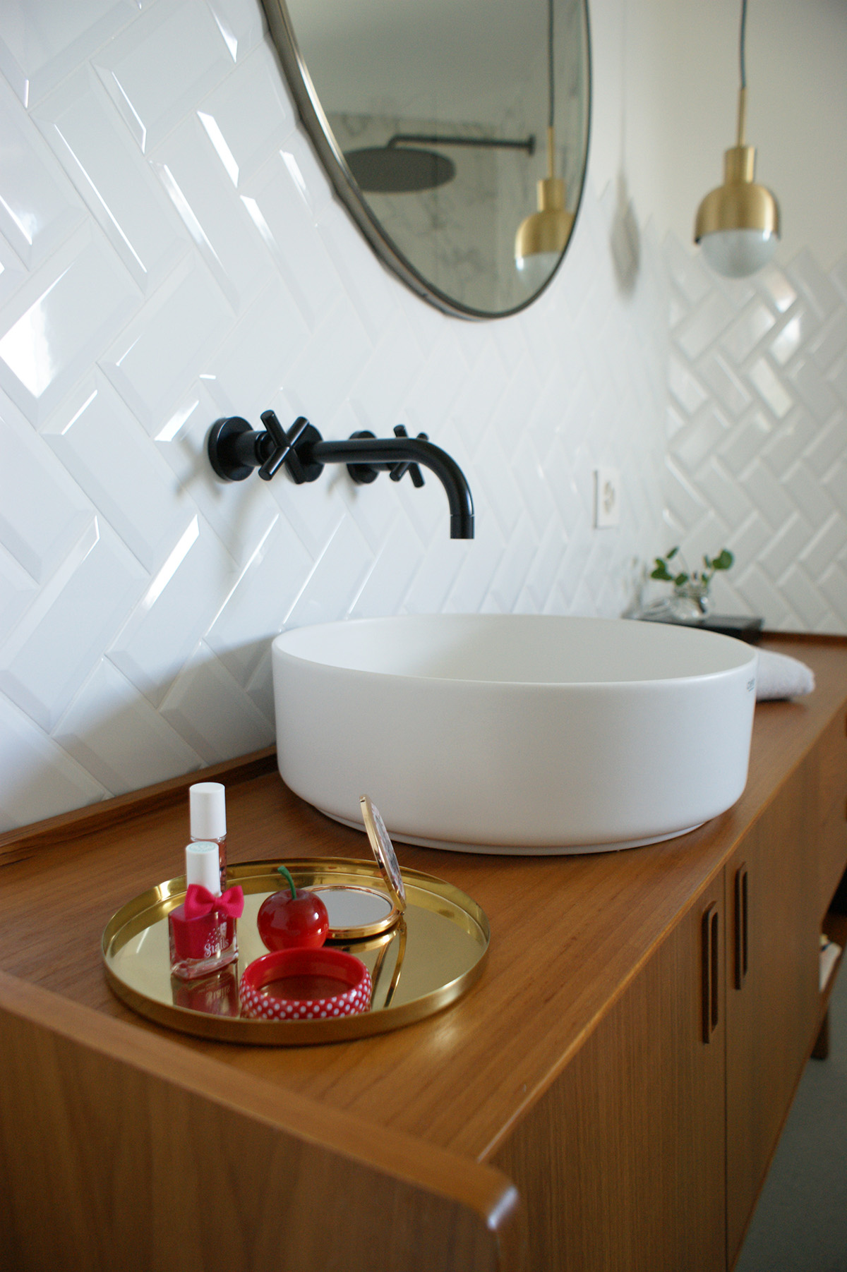 Pour la salle de bain de notre fille, nous voulions une touche retro, un voyage dans le temps. Nous souhaitions récupérer un meuble de ma grand-maman pour y poser une vasque. Mais, les dimensions, les contraintes techniques et le temps nous ont fait changer d’avis. C’est finalement une bonne chose car l’ensemble est, je trouve, réussi.